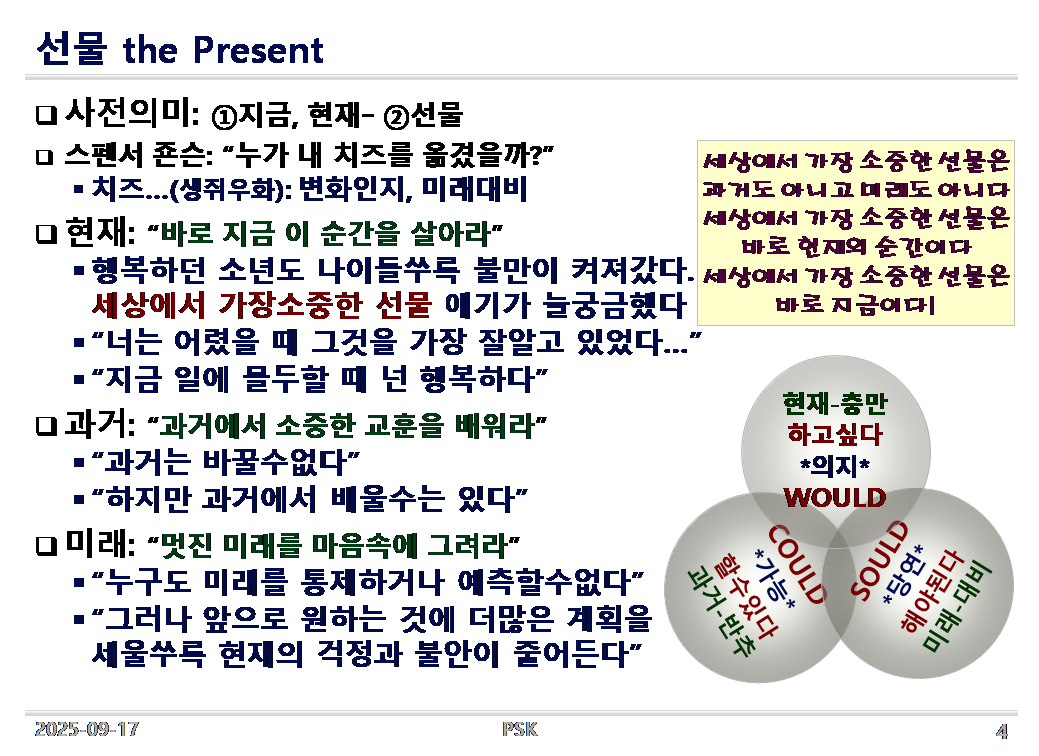 스펜스 존슨/Spencer Johson 은 그의 저서 '선물(Present)'이란 책에서 나를 행복하게 하는 선물을 주겠다며 지혜(智慧)를 선물했는데, 그 지혜 속에는 세상에서 가장 소중한 선물이 바로, <지금><오늘> 이라고 일러 주었습니다.